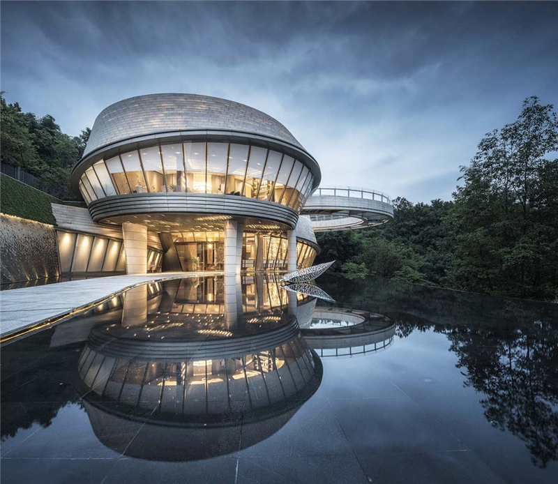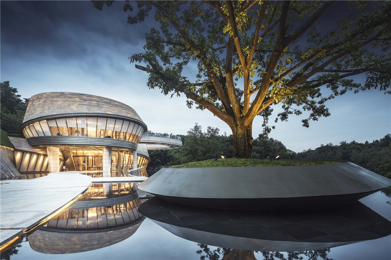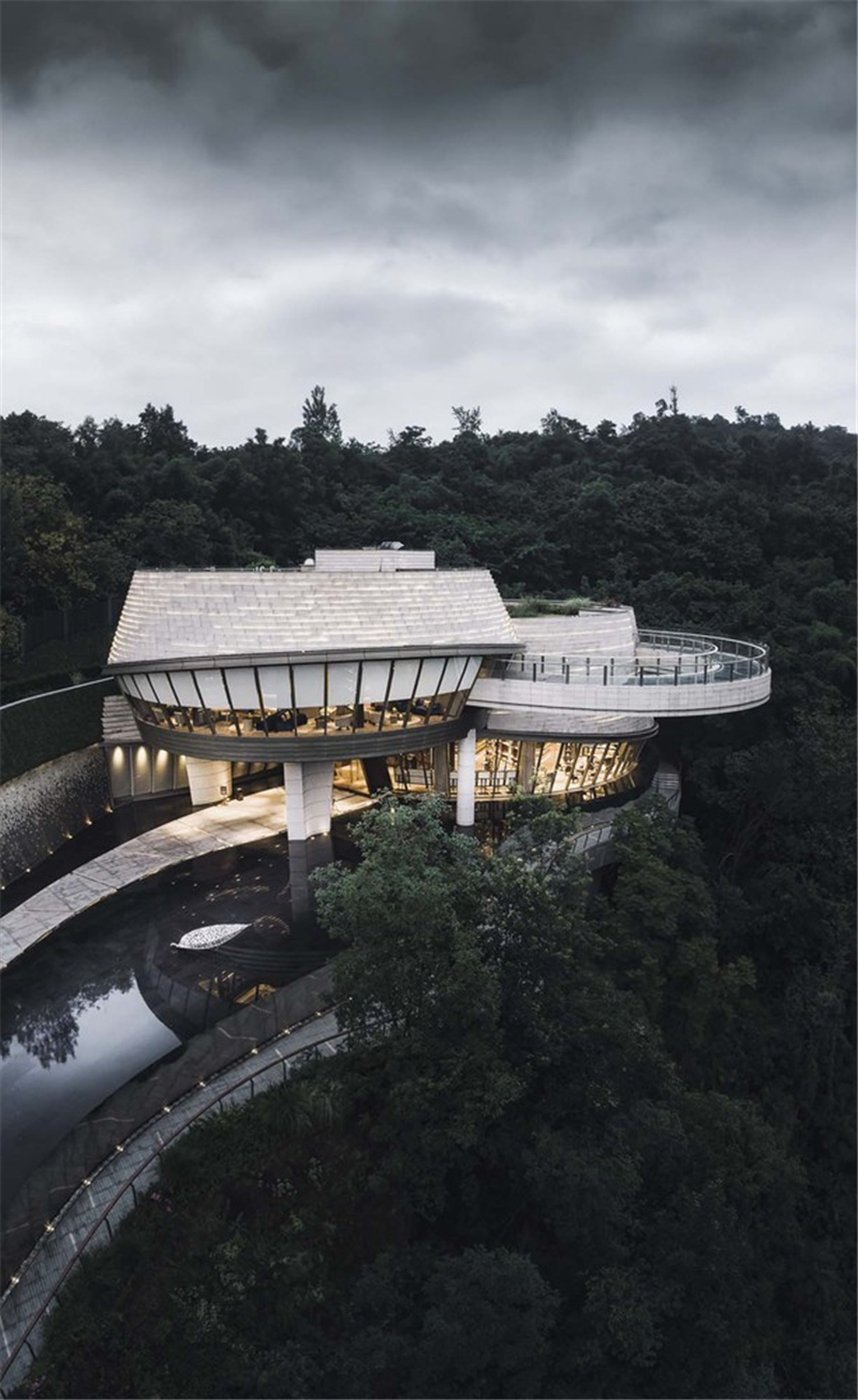 金属结构与玻璃幕墙、天桥,构成了“∞”之形,其名亦有循环之意,仿佛映射山间的春去秋来,将这无限往复的生命之环,由抽象凝实为具体。