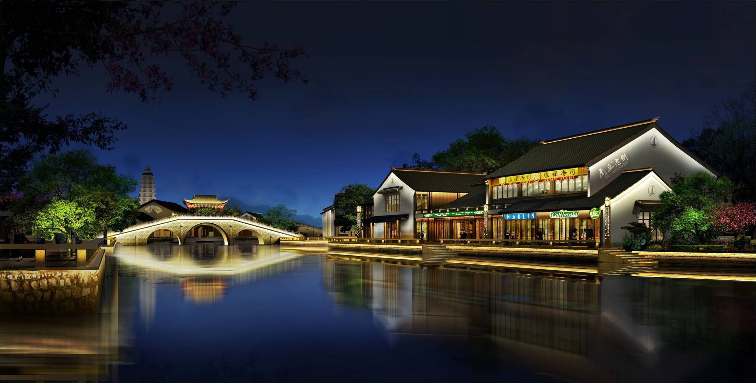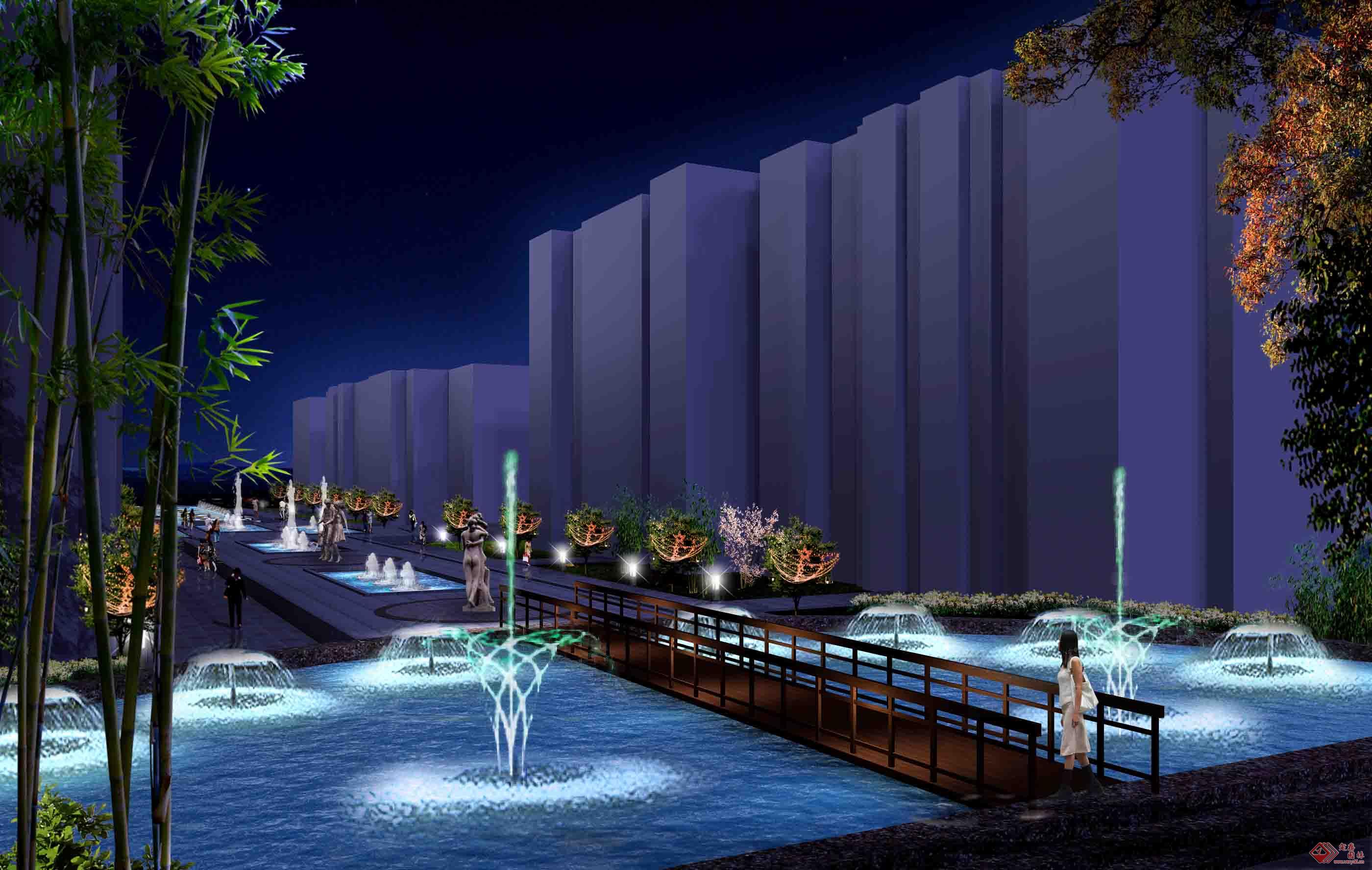 运用超前的照明设计手段:隐一一露,抑一一扬,营造一个灯光与水景相结合的水景灯光文化。“小桥流水” 别具一格,在夜间更显琼楼玉宇,彩虹飞架,水波滩涟,使人赏心悦目,形成移步换景的水景效果。