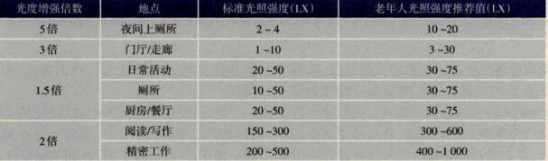 由于老年人的瞳孔缩小,进人眼球的灯光减少,相对年轻人所需的照度水平而言,老年人居室内的照明水平应该提高到日常的2到3倍,研究表明,老年人所处环境光的照度水平系该*少该有300 lx才能使老年人感到舒适图,而老年人在阅读、起夜、吃饭等日常活动中所需要的*适宜的照明水平不尽相同。日本的学者横田健治对老年人的光照水平与年轻人所需光照进行了研究,得到了日常生活中适合老年人照明光度的推荐值。
