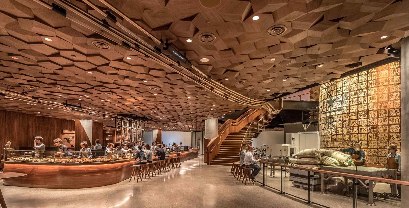 咖啡厅环境比一般的餐厅要暗,要创造舒适安逸的照明氛围,给人以安定感.星巴克会通过照明形成趣味,会对咖啡制作的区域进行突出,希望展示咖啡的烘培过程来提升氛围;而其空间内其他区域的色温均较为温和,光照也比较均匀。