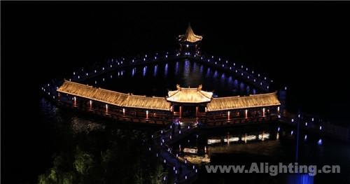 设计施工团队拆除了海心亭的旧栏杆,换上与亭子建筑风格一致的新栏杆。考虑到海上视点,海心亭顶部灯光处理得比较亮;而考虑到亭子作为观景平台的作用,则严控眩光。*终,金色的亭子、蓝色点光装饰的围栏,与海上平静的倒影交相辉映,为洱海月色更添情趣。