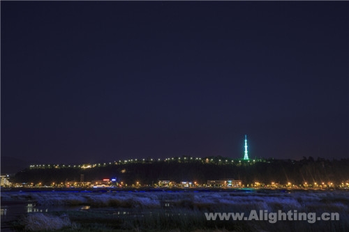 设计施工团队没有用大面积投光的方式对团山进行照明,而是利用特制路灯,勾勒出连绵起伏的山脊线,形成若隐若现的效果。简单的照明将夜色中的发射塔衬托得更加熠熠生辉。